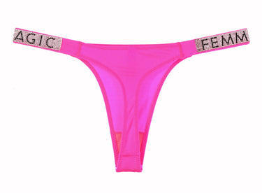 Pink panty thing with FEMMAGIC rhinestones on hips. Cotton crotch.