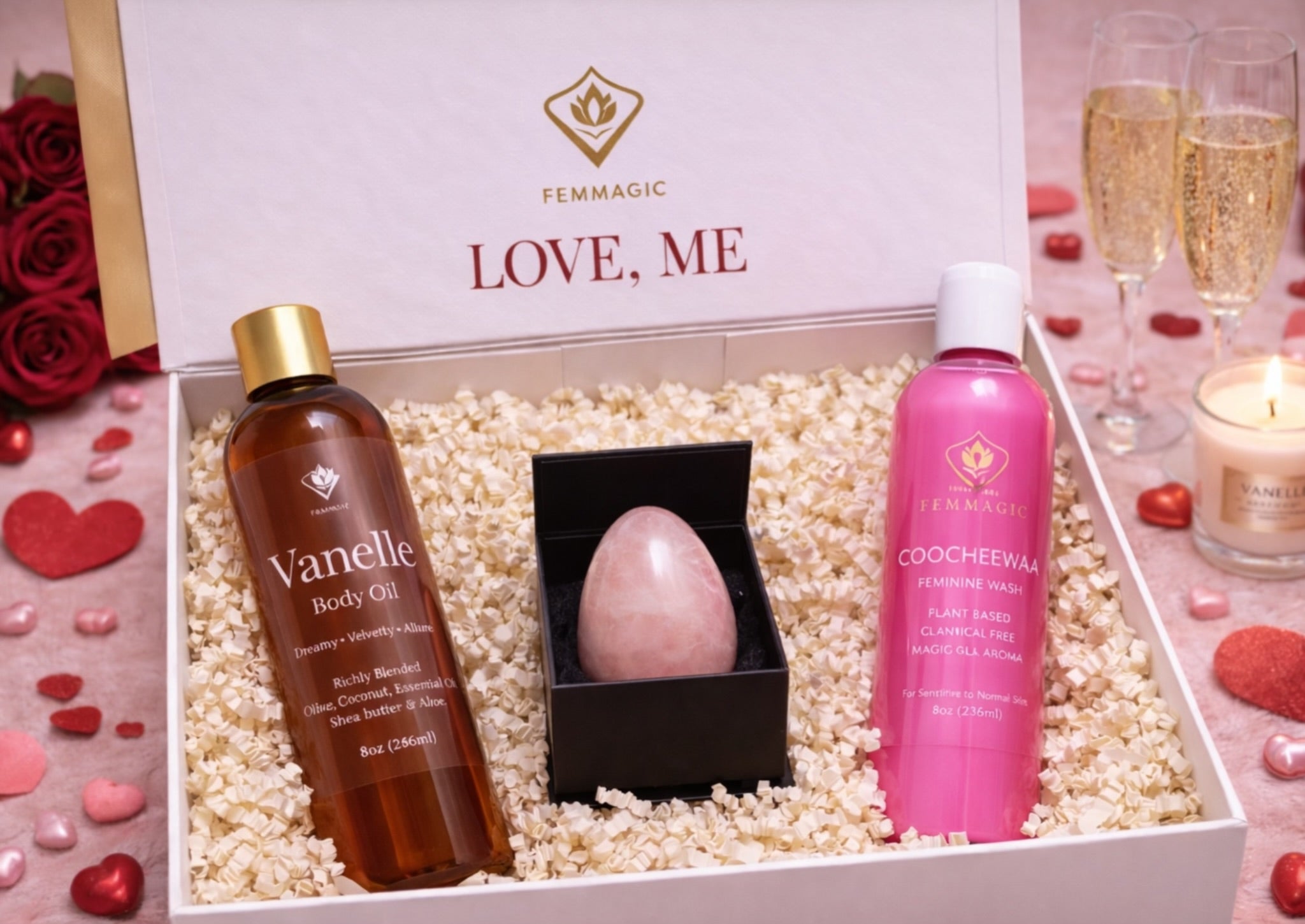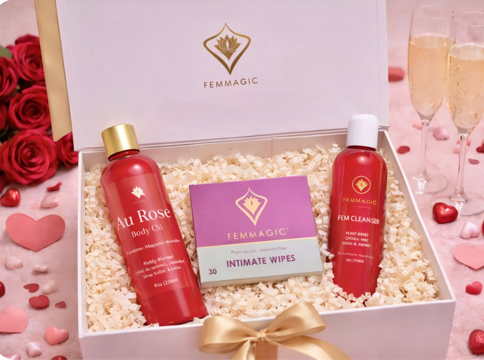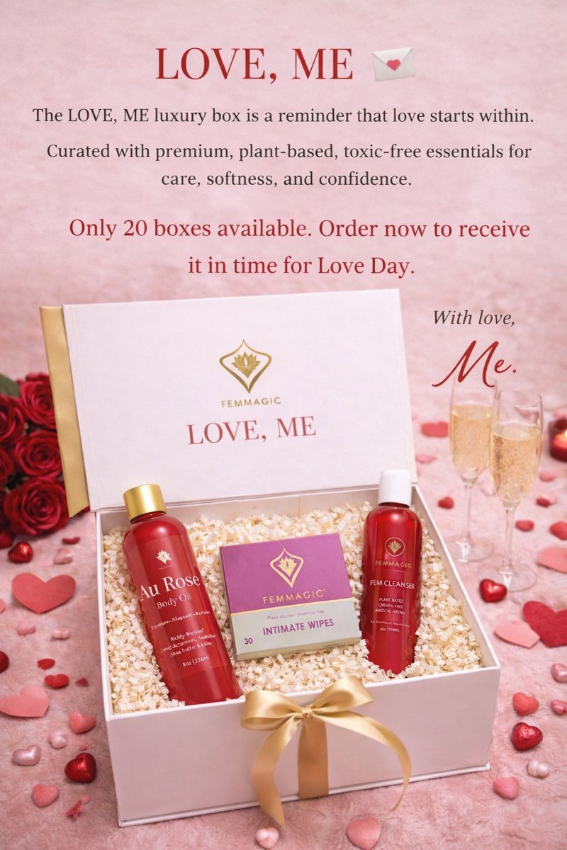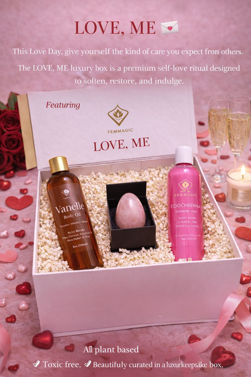 The FEMMAGIC Love Box is a premium self-care set created to nourish, soften, and restore feminine confidence. Thoughtfully placed in a luxury keepsake box, this bundle is perfect for loving yourself or gifting someone special.